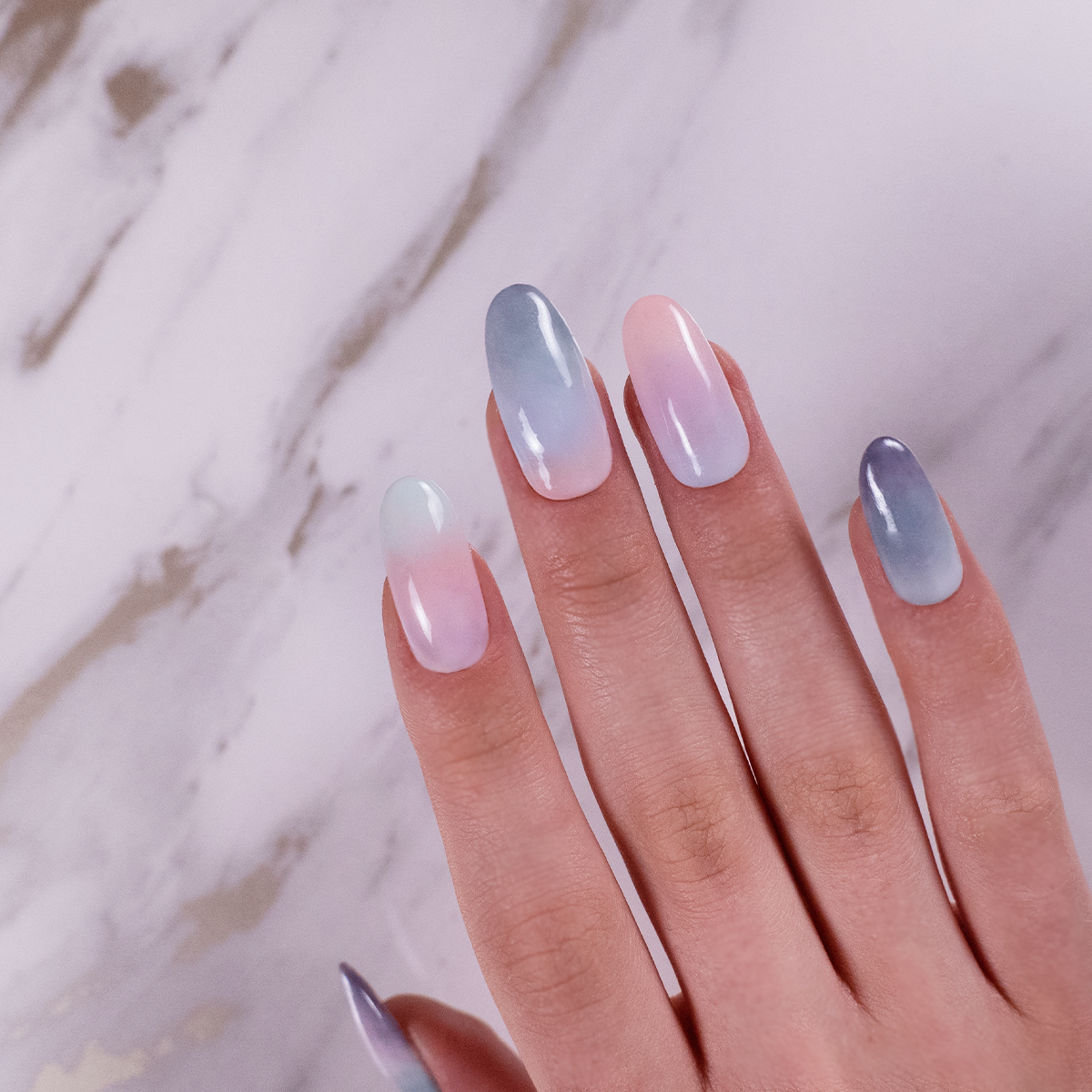 Imaginez un ballet harmonieux entre des nuances délicates de rose poudré, de bleu ciel et de lavande. L'idée est de créer grâce à notre Tuto une transition fluide, comme si le pinceau de l'artiste avait caressé vos ongles avec la douceur d'une brise légère.