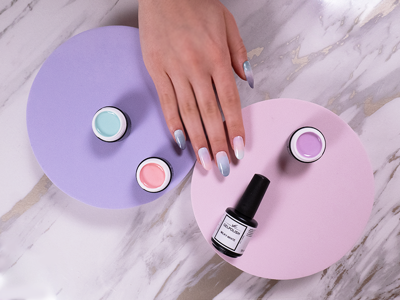 - Appliquez une fine couche de Gelpolish Milky white afin de rendre le dégradé encore plus doux avec catalyse de 60 secondes.