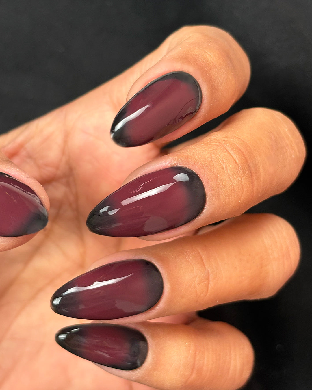Après avoir appliqué vos capsules américaines Soft Gel Nail Tips Almond Shape, appliquez 1 à 2 couches de Gel Polish VSP Black noir pour créer la base de vos Aura Nails.